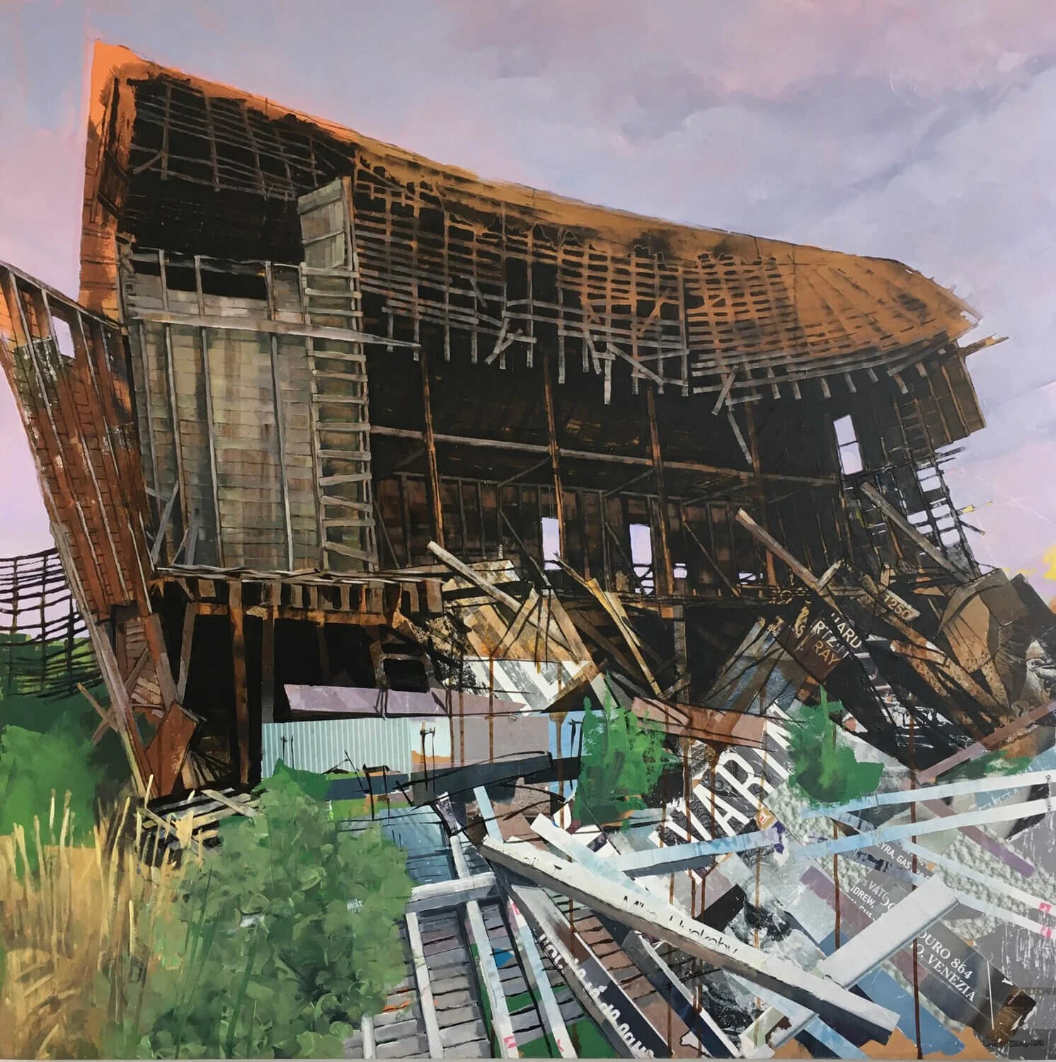 Her creative focus has turned away from highly designed spaces toward pragmatic architecture: buildings shaped by the necessity of manufacture, industry and – more recently – agriculture. She explores the demise and abandonment of structures no longer suited for today’s industries, and she searches for the accidental “moments” of beauty caused by their neglect and decay. At a surface level, these moments include the rust on an old sea-wall, the decay of wooden pier structures, and faded signage advertising products and businesses of the past. On a deeper level, these moments include the structural reveal which happens during the demolition process, or during the slow collapse of buildings as seen in her recent work with agricultural barns.