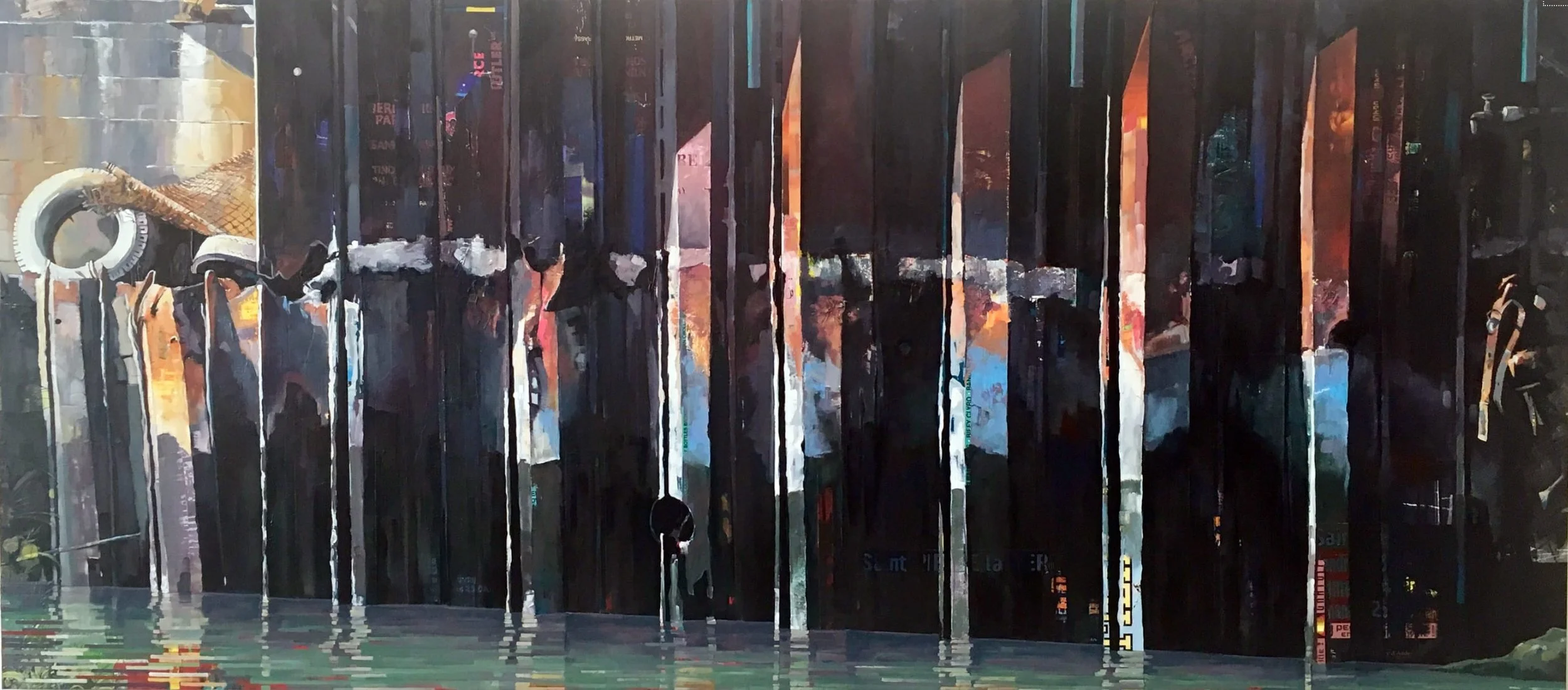 What all of Mackey’s work has in common is her interest in the history of the structures and the people who used them. She discovers forgotten stories told by layers of construction scars, signage, and abandoned artifacts. Over the years, she has collected old signpost templates and transcribed fading advertising signs – both of which she regularly uses in her work. Because of the prevalence of posters, especially in urban environments, Mackey also began to use this material in her work, adding a layer of narrative beneath and between the layers of paint. She now collects fragments of posters from streets wherever she goes in the belief that people’s stories are essentially the same wherever they live. The addition of these fragments, some of which peek through the paint and some which shout their presence, reminds us of ubiquitous layered narratives and allows for a more tactile viewing experience.