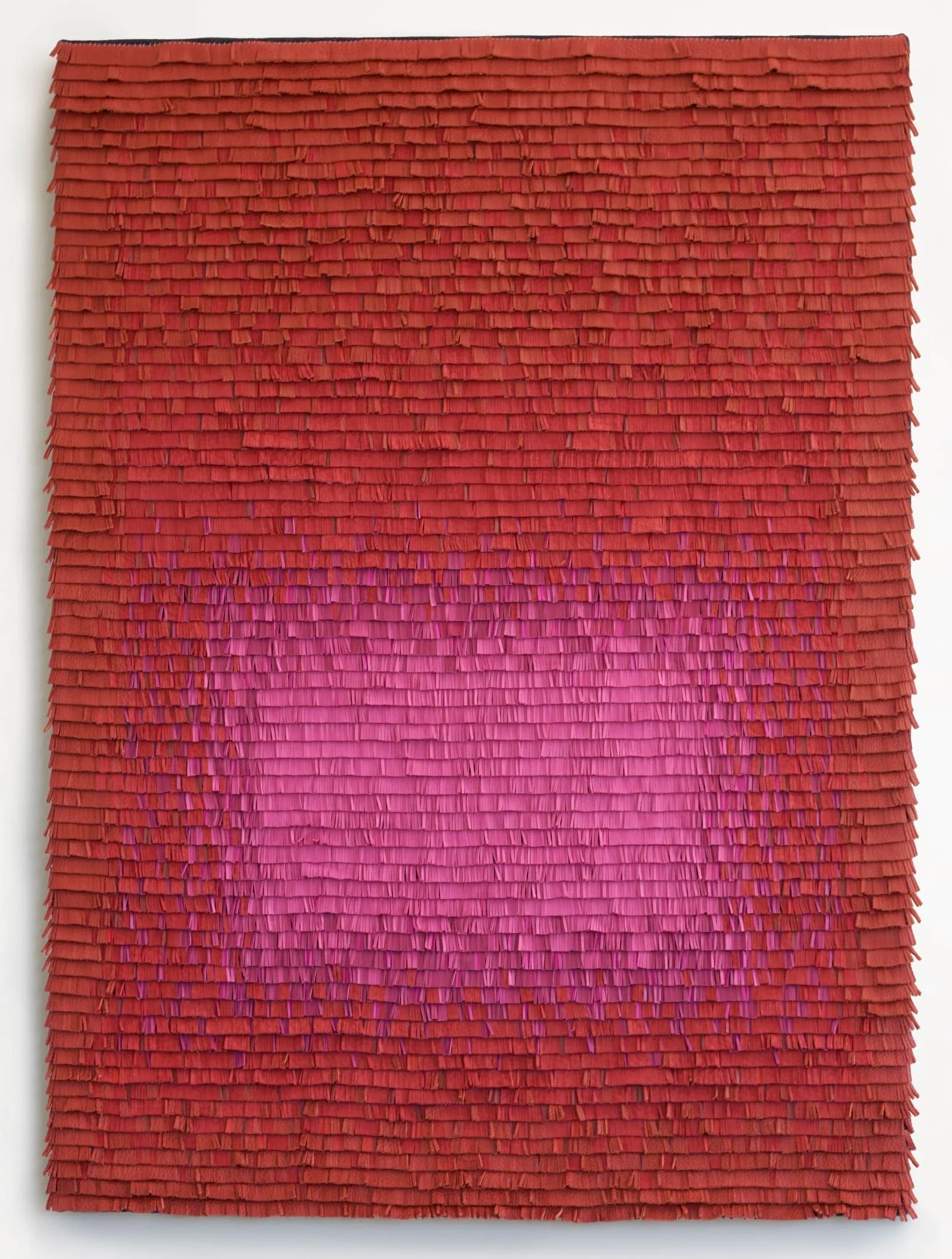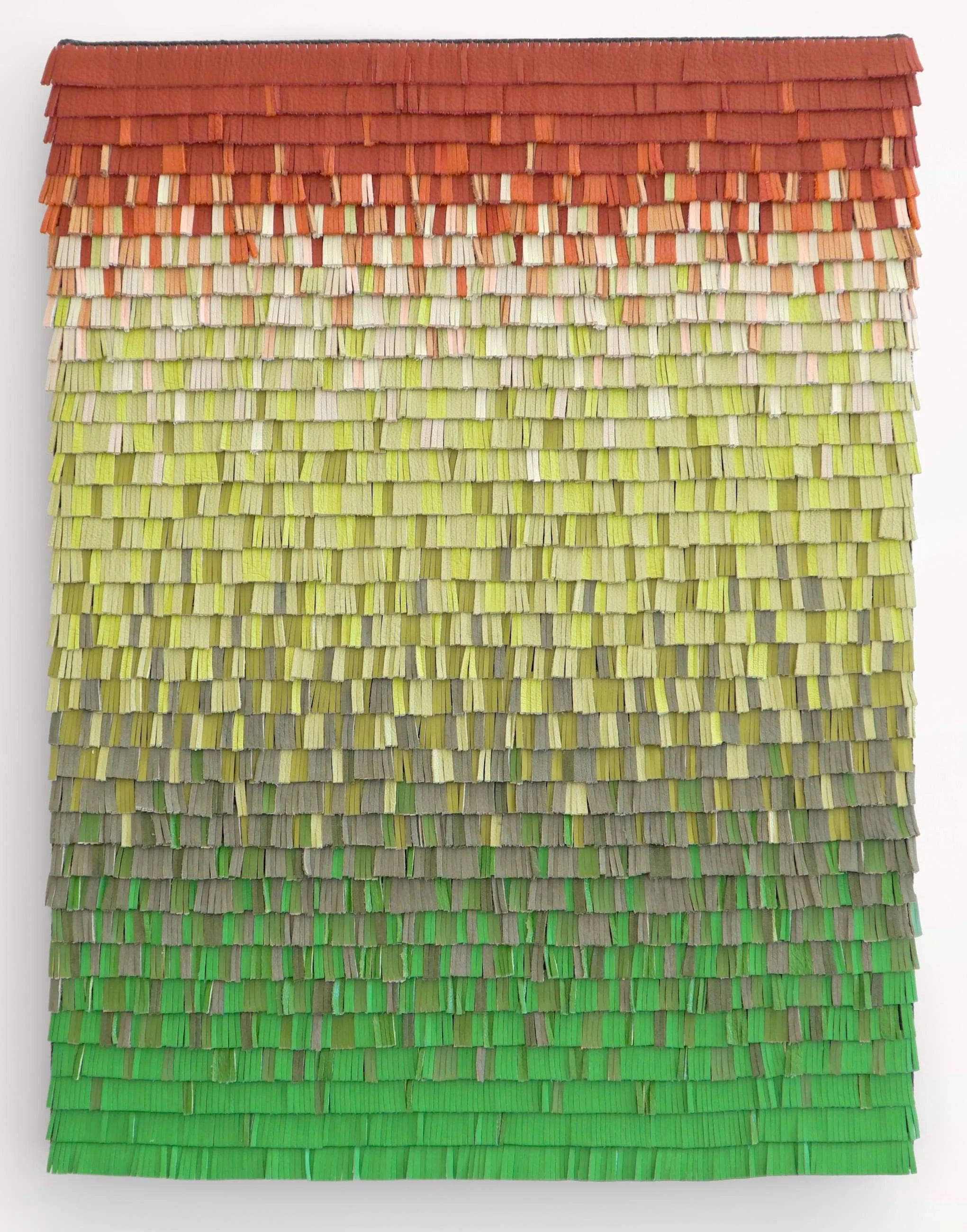 Lusven’s work challenges the trivialization of the textile practice brought on by industrialization, by bringing together art and the common. Lusven uses discarded materials or scraps of leather to echo this devalued textile practice. These materials are transformed through her hands as she hand-cuts then handweaves them with dead stock linen threads from shoemaking or bookbinding.