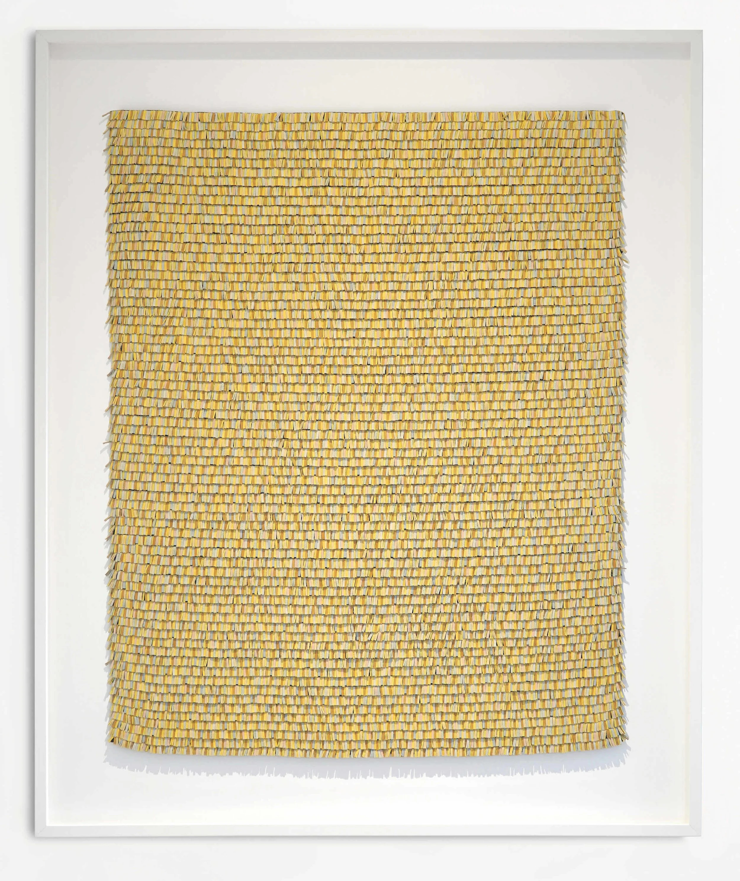 Handwoven from linen and off-cut leathers, in a white wood frame with museum acrylic