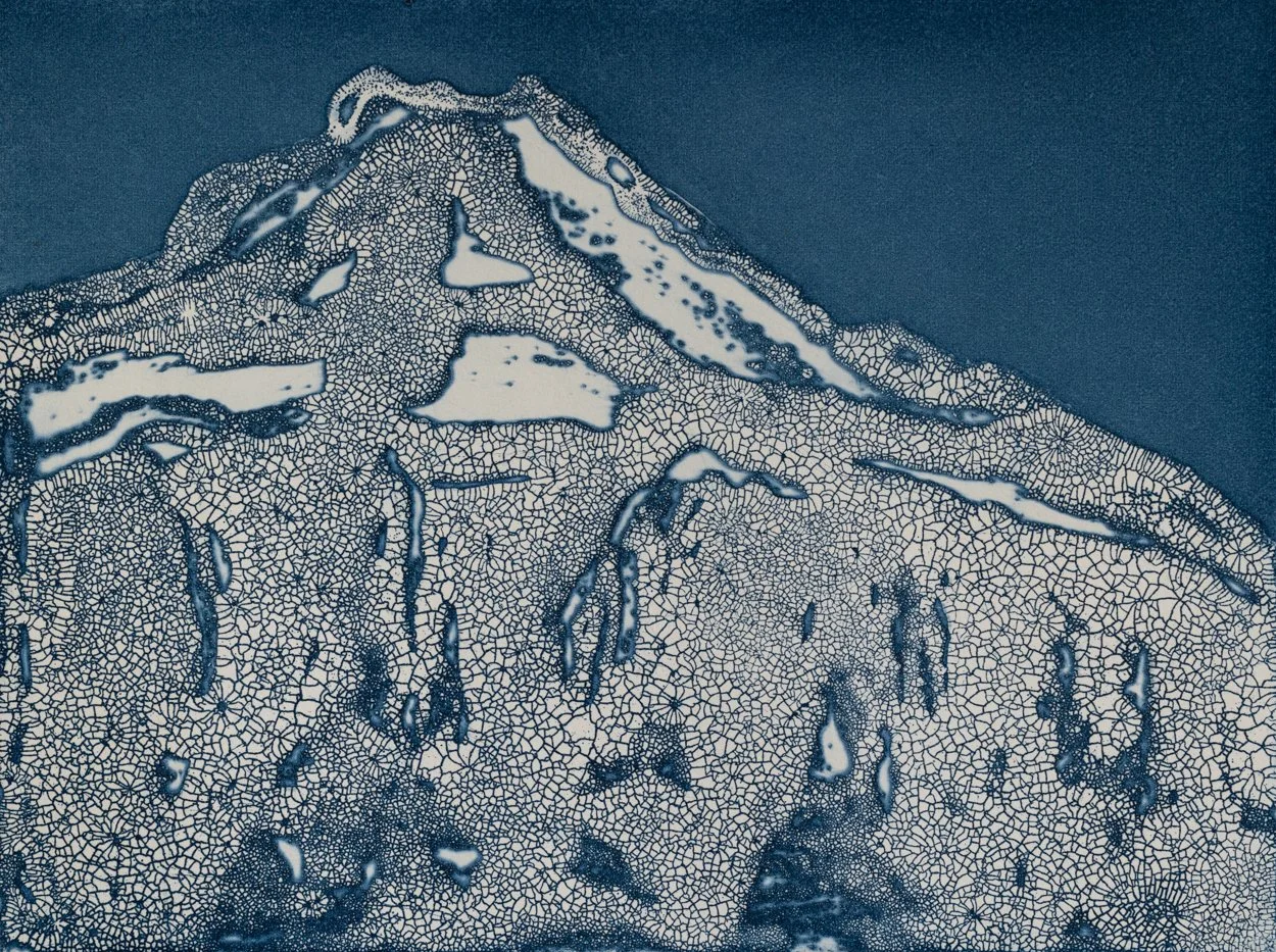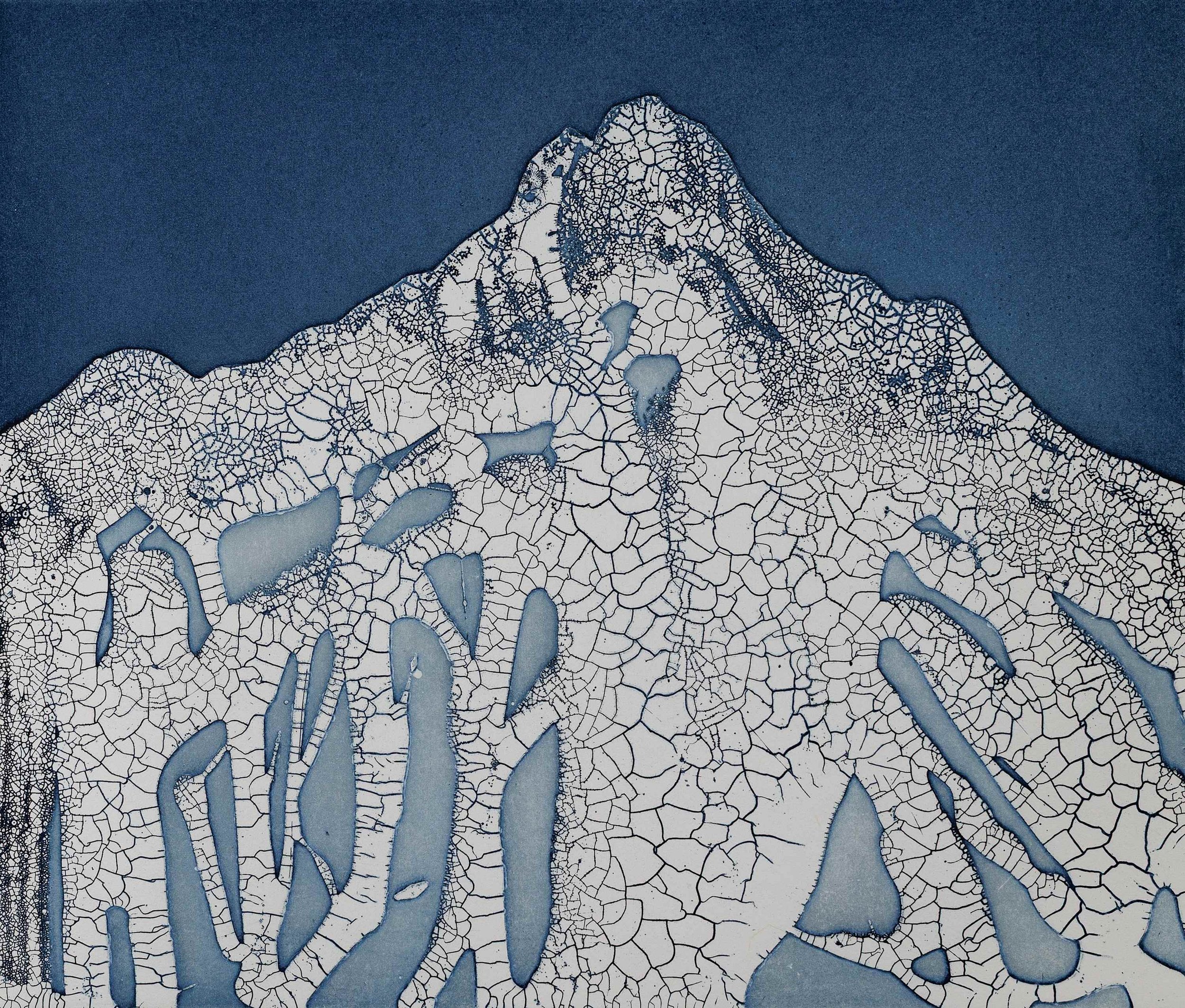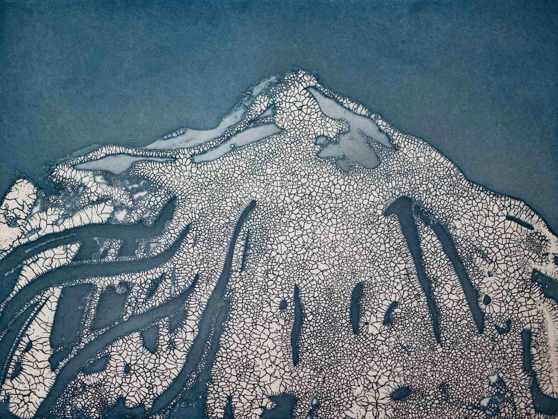 The etchings in Murray’s Glacial Melt series convey the grandeur of Arctic mountains and glaciers, immense, timeless forms now shifting under the pressure of a warming planet. The experimental techniques used to create the copper plates result in spontaneous and often uncontrollable fissures, mimicking the fracturing of ice sheets, glacial calving, and melt. Cracks, texture, and tone depict transformation and erosion. The process of creating each plate becomes a metaphor for the ever-changing connection between ice and water, solid and liquid states, and the cascading changes happening in the Arctic.