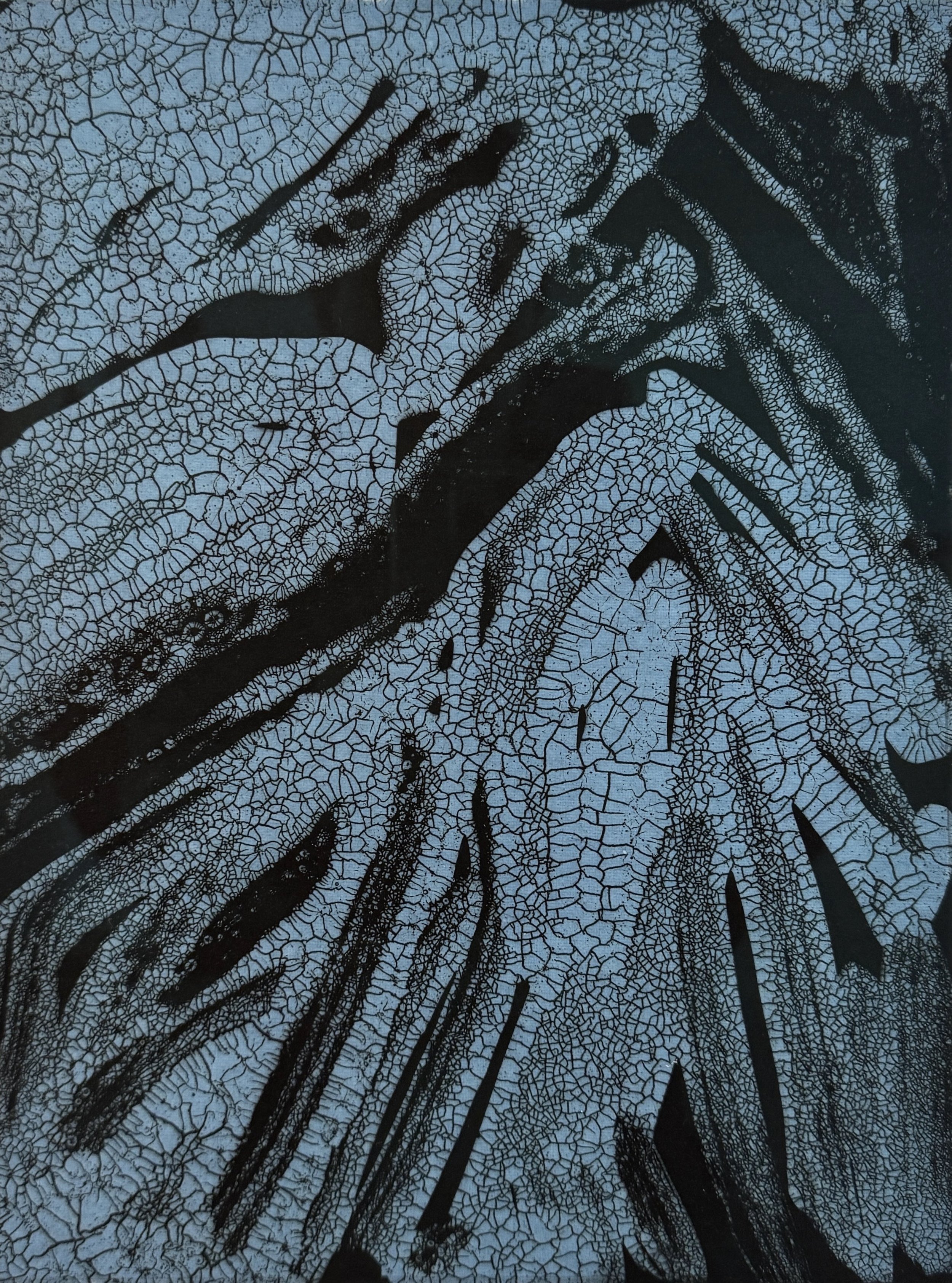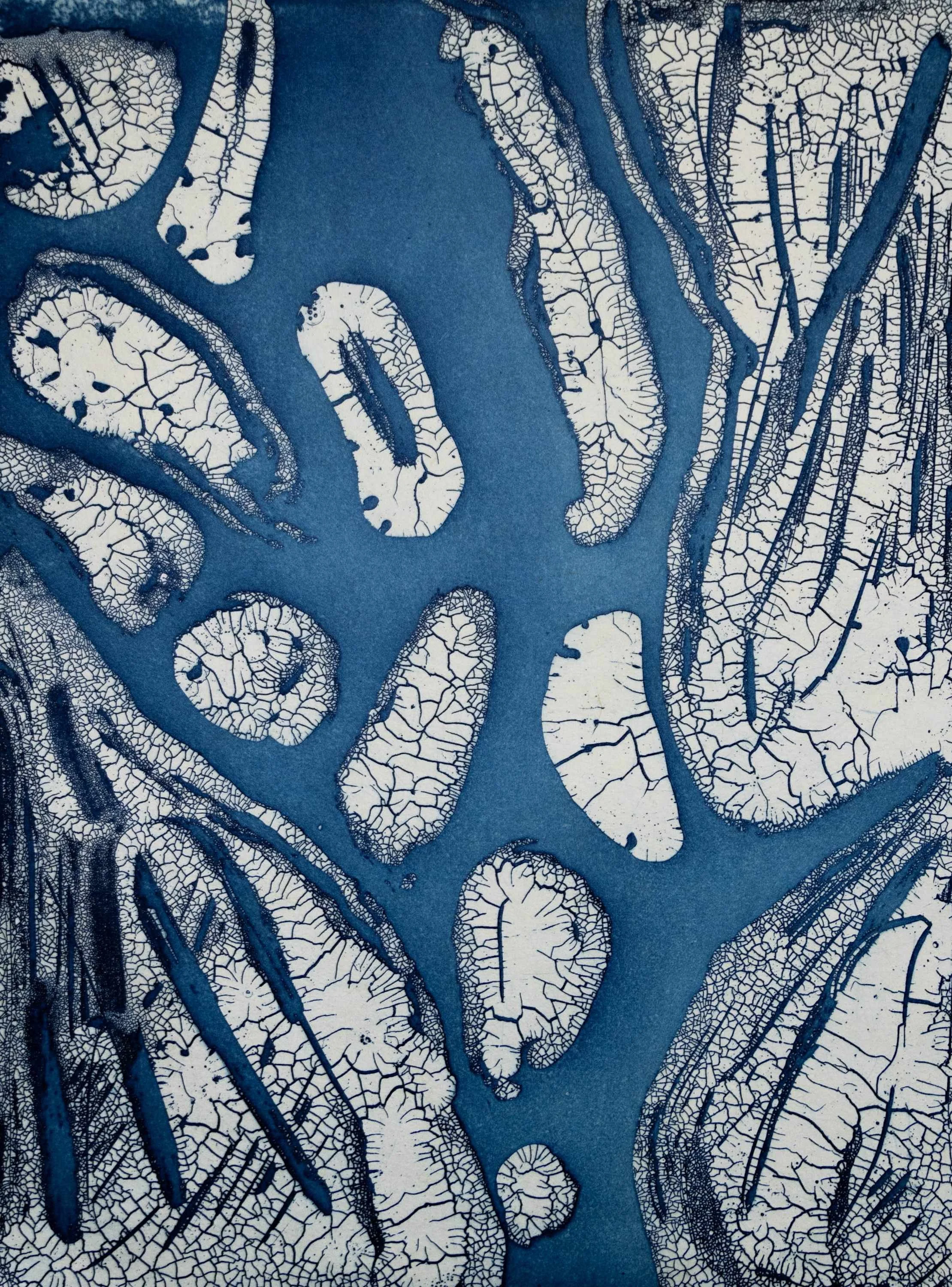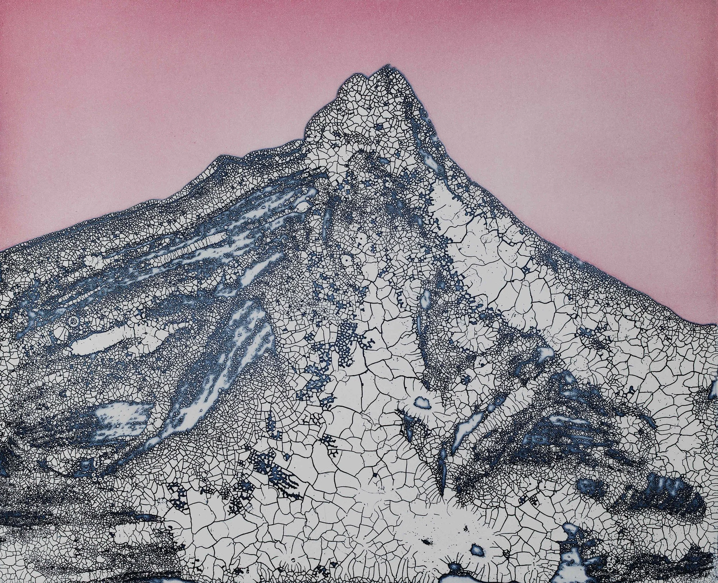 The etchings in Murray’s Glacial Melt series convey the grandeur of Arctic mountains and glaciers, immense, timeless forms now shifting under the pressure of a warming planet. The experimental techniques used to create the copper plates result in spontaneous and often uncontrollable fissures, mimicking the fracturing of ice sheets, glacial calving, and melt. Cracks, texture, and tone depict transformation and erosion. The process of creating each plate becomes a metaphor for the ever-changing connection between ice and water, solid and liquid states, and the cascading changes happening in the Arctic.
